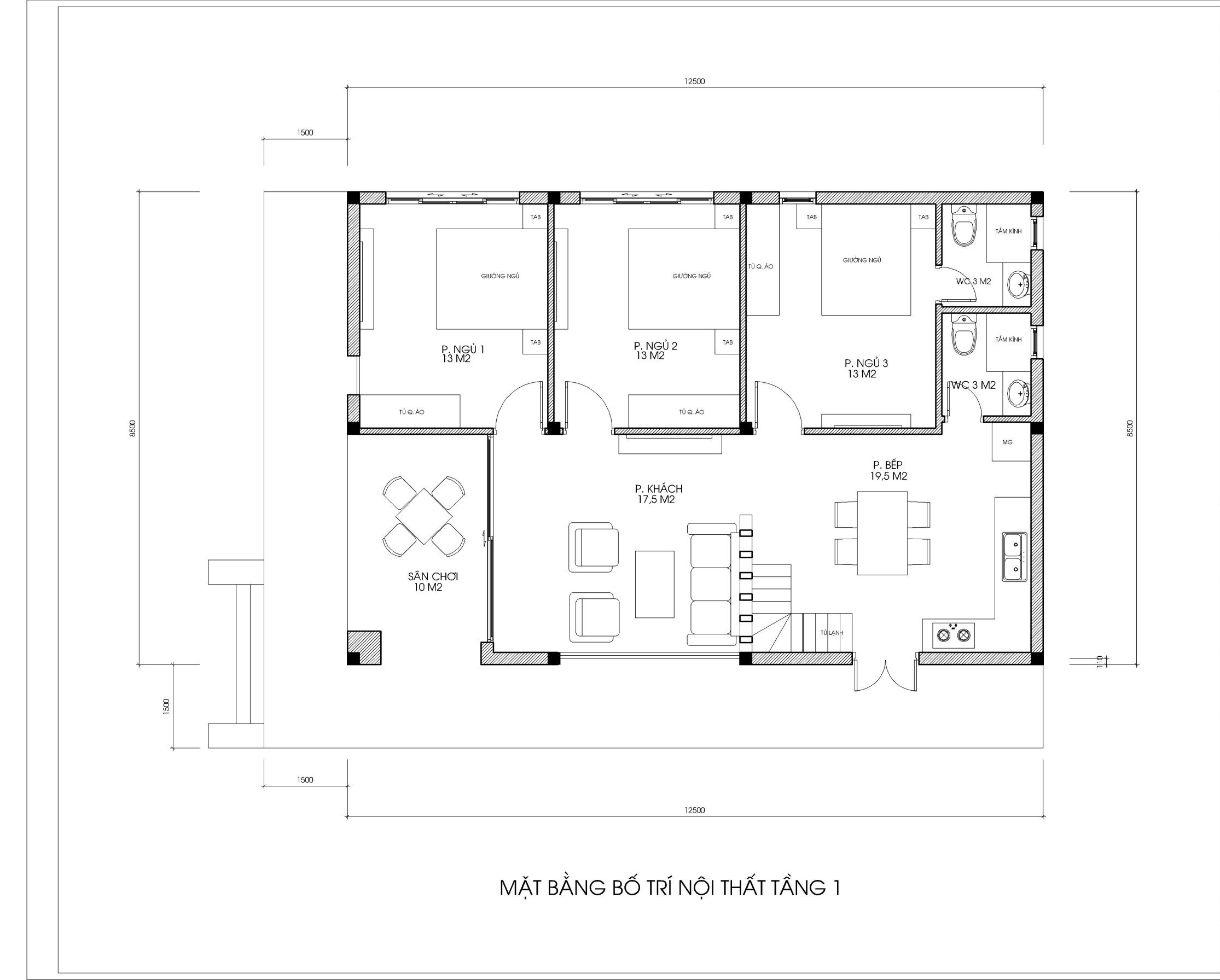 • TẦNG 1:  Phòng khách, phòng bếp, 2 phòng ngủ , nhà vệ sinh chung , phòng ngủ khép kín, sân chơi.